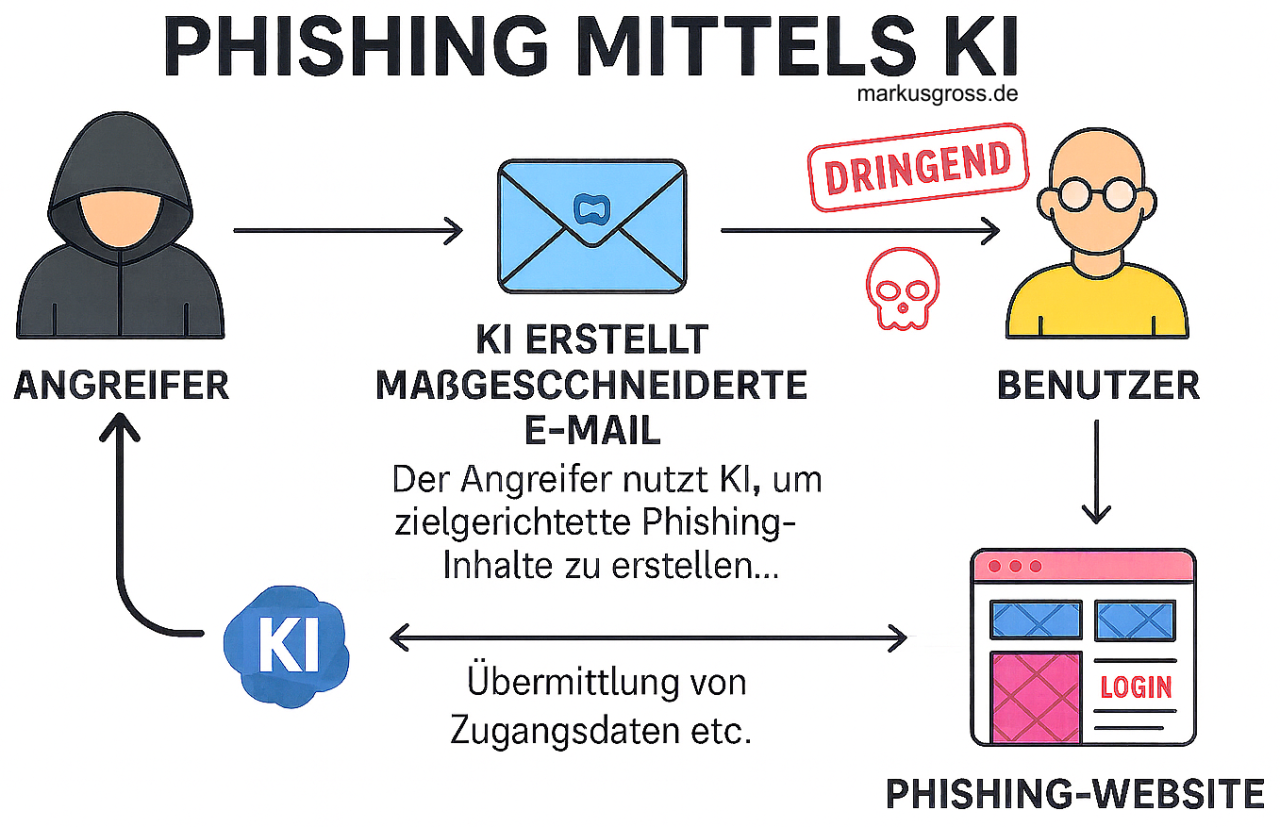 Die begleitende Grafik „Phishing mittels KI“ oben zeigt den Ablauf in fünf klaren Schritten: Links der Angreifer, der seine Texte und Täuschungen mithilfe von KI erstellt; in der Mitte die Phishing-E-Mail; rechts der Benutzer, der zieltreu adressiert wird; unten die täuschend echte Phishing-Website, die Zugangsdaten einsammelt; und der entscheidende Rückpfeil, über den die erbeuteten Informationen in Echtzeit zum Angreifer fließen. Dieser Datenstrom ist der Moment, in dem aus einer hübschen Nachricht ein Sicherheitsvorfall wird.